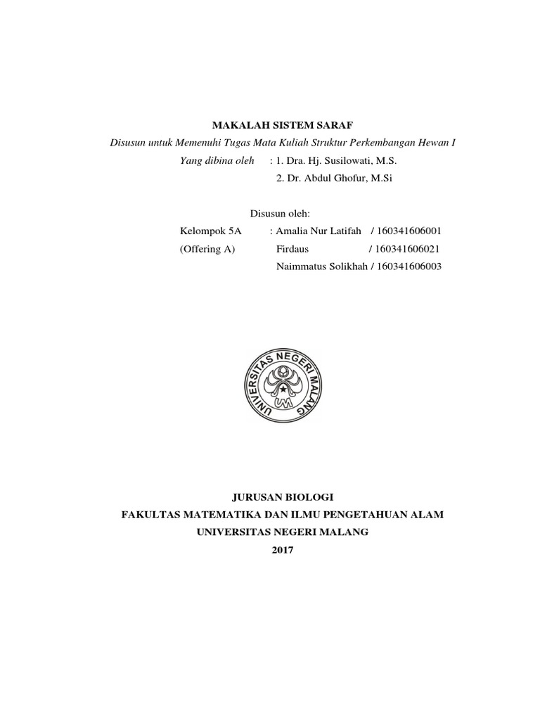 Doc Makalah Sistem Saraf Manusia Yuli Hardiyanti Academia Edu from 0.academia-photos.com Menyampaikan rangsangan dari reseptor untuk dideteksi dan direspon oleh tubuh. Seluruh aktivitas didalam tubuh manusia diatur oleh sistem saraf. Oleh karena itu, secara garis besar di dalam makalah ini, penulis akan membahas bagaimana sistem saraf pada hewan invertebrata. 160110150155 ellania ramadhani 160110150156 jeahani trisya oktawati 160110150157 ifrialda fatwa f. Makalah sistem saraf bab i pendahuluan 1.1 latar belakang seluruh aktivitas didalam tubuh manusia diatur oleh sistem saraf. Sistem saraf dibagi menjadi dua, yaitu sitem saraf pusat dan. Sistem saraf juga mengatur aliran darah, dan konsentrasi osmotik darah. Dengan kata lain, sistem saraf berperan dalam pengontrolan tubuh manusia.